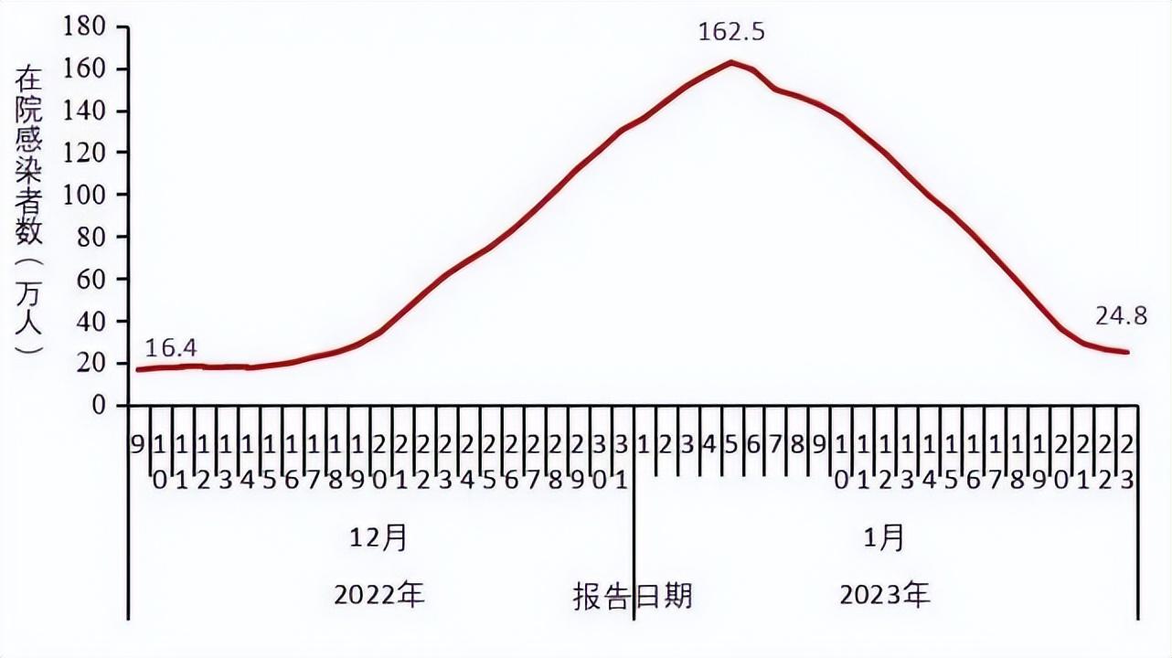 全国在院新冠感染者于2023年1月5日达到峰值162.5万人,随后持续下降,1月23日下降至24.8万人,较峰值减少了84.8%(图3-1)。